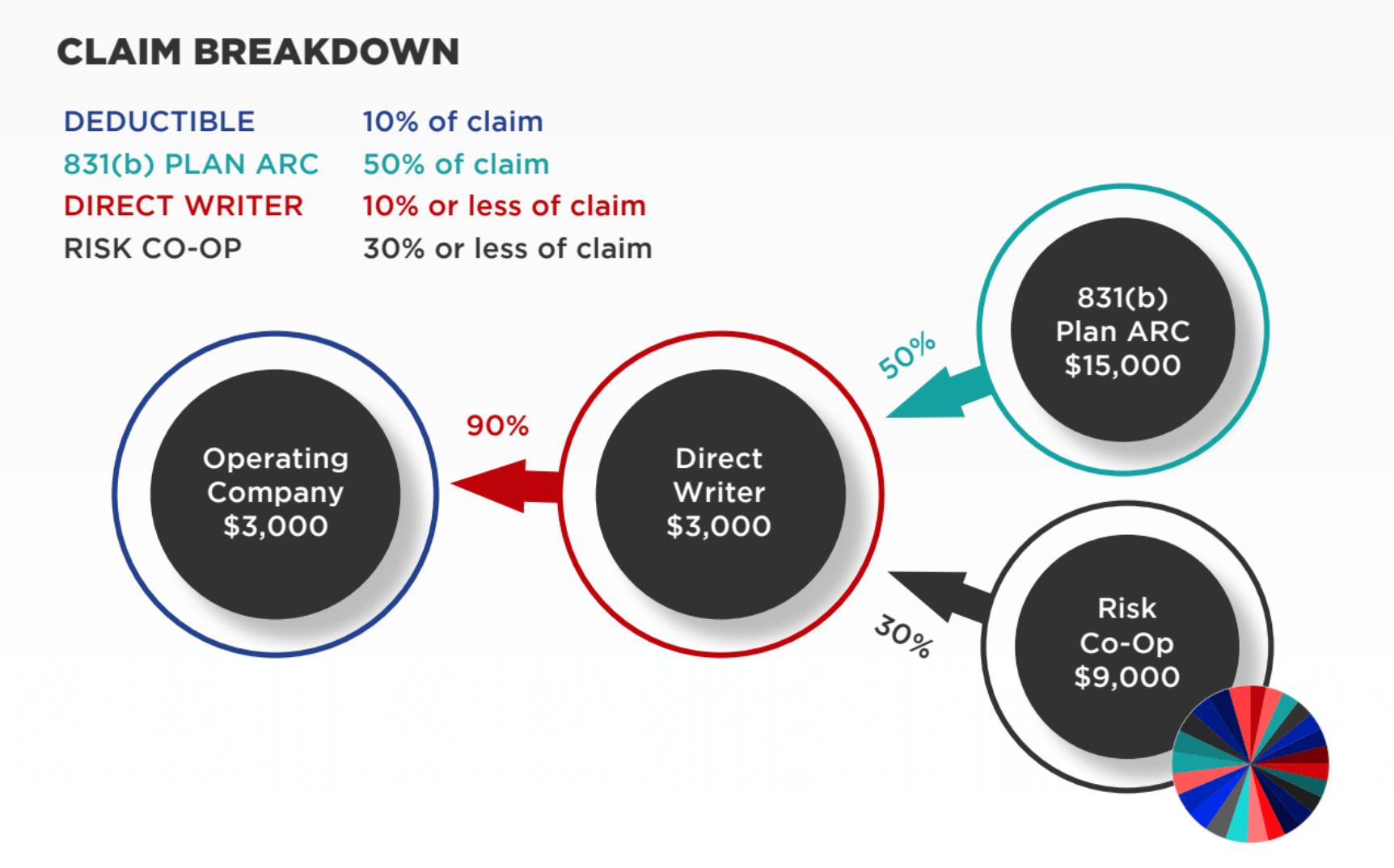 The outline below breaks down how Dr. Gutierrez’s $30,000 claim was paid by all parties, consisting of a deductible, his 831(b) Plan ARC, the direct writer, and the business interruption Risk Co-Op.